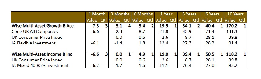 In March, the IFSL Wise Multi-Asset Growth Fund was down 7.3%, behind the CBOE UK All Companies Index (-6.6%) and its peer group, the IA Flexible Investment sector (-6.1%). In a difficult month, there were few places to hide. Our renewables and infrastructure basket protected capital, thanks to their defensive characteristics and being beneficiaries of rising power prices. Our bond managers, particularly Premier Miton Strategic Monthly Income Bond Fund and TwentyFour Strategic Income Fund benefitted from their active management of interest rate risk, as did Pacific G10 Macro Rates by actively taking advantage of short-term volatility. Finally, Pantheon International, after a weak start of the year, saw some recovery in its discount which helped its monthly performance.