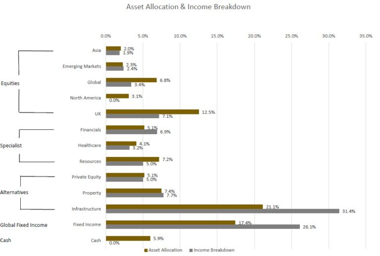 October was a reasonably busy trading month for the fund. Within renewables, we switched our holding in Greencoat UK Wind into Foresight Environmental Infrastructure, a more diversified company with less debt and lower sensitivity to power prices and government subsidies. Following the departure of the managers, we also switched our holding in Schroder Emerging Market Value into Prusik Asian Equity Income and Pacific North of South Emerging Markets Equity Income Opportunities. The Aberdeen Asian Income holding was switched at the same time. We initiated holdings in CVC Income & Growth, which invests in senior secured loans and other corporate credit, and in Life Science REIT, a specialist property fund committed to selling its property holdings over the next 18 months. We also introduced Brickwood Global Value, a global equity fund, funded by a reduction in our Schroder Global Equity Income position. Elsewhere, we took profits in holdings that have performed strongly, such as Ecofin Global Utilities & Infrastructure, BlackRock World Mining, International Biotechnology Trust and ICG Enterprise, and recycled capital into names that have lagged. As such, we increased our exposure to Aberforth Smaller Companies, Helical, International Public Partnerships, Odyssean Investment Trust and Polar Capital Global Financials.
